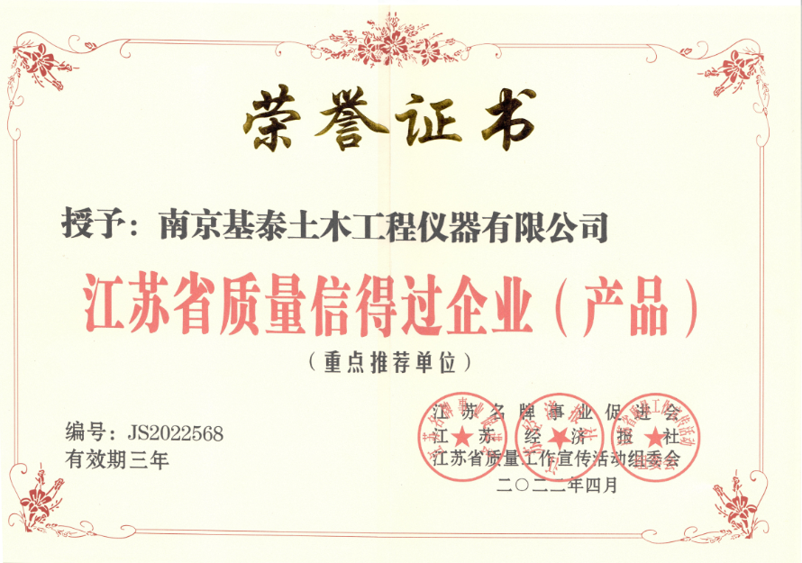 南京基泰土木工程儀器有限公司榮獲“江蘇省質(zhì)量信得過企業(yè)(產(chǎn)品)”重點(diǎn)推薦單位。